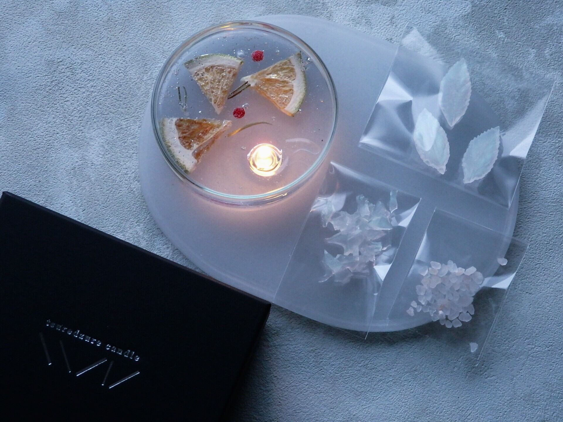 内容量 : シャーレキャンドル1つ、葉キャンドル(3粒)、クラッシュキャンドル(柑橘)、岩塩